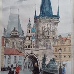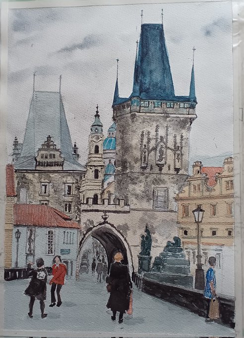 3 11 [百塔の街] 0180 5.4.24 モルダウ川に架かるカレル橋はプラハ最古の石橋だそうです #水彩風景画 #旧市街側の東塔 23/04/24 05:40