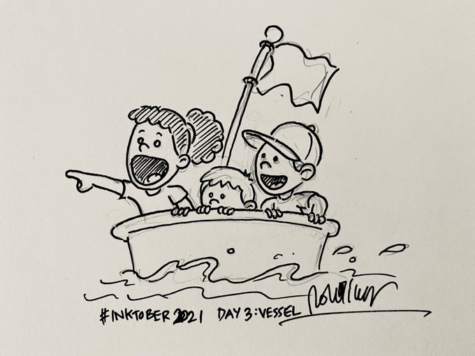#inktober2021 Day 3: Vessel Maybe 5cm x 5cm. I like these 3 little adventurers. I wonder what they’re doing and where they’re going?