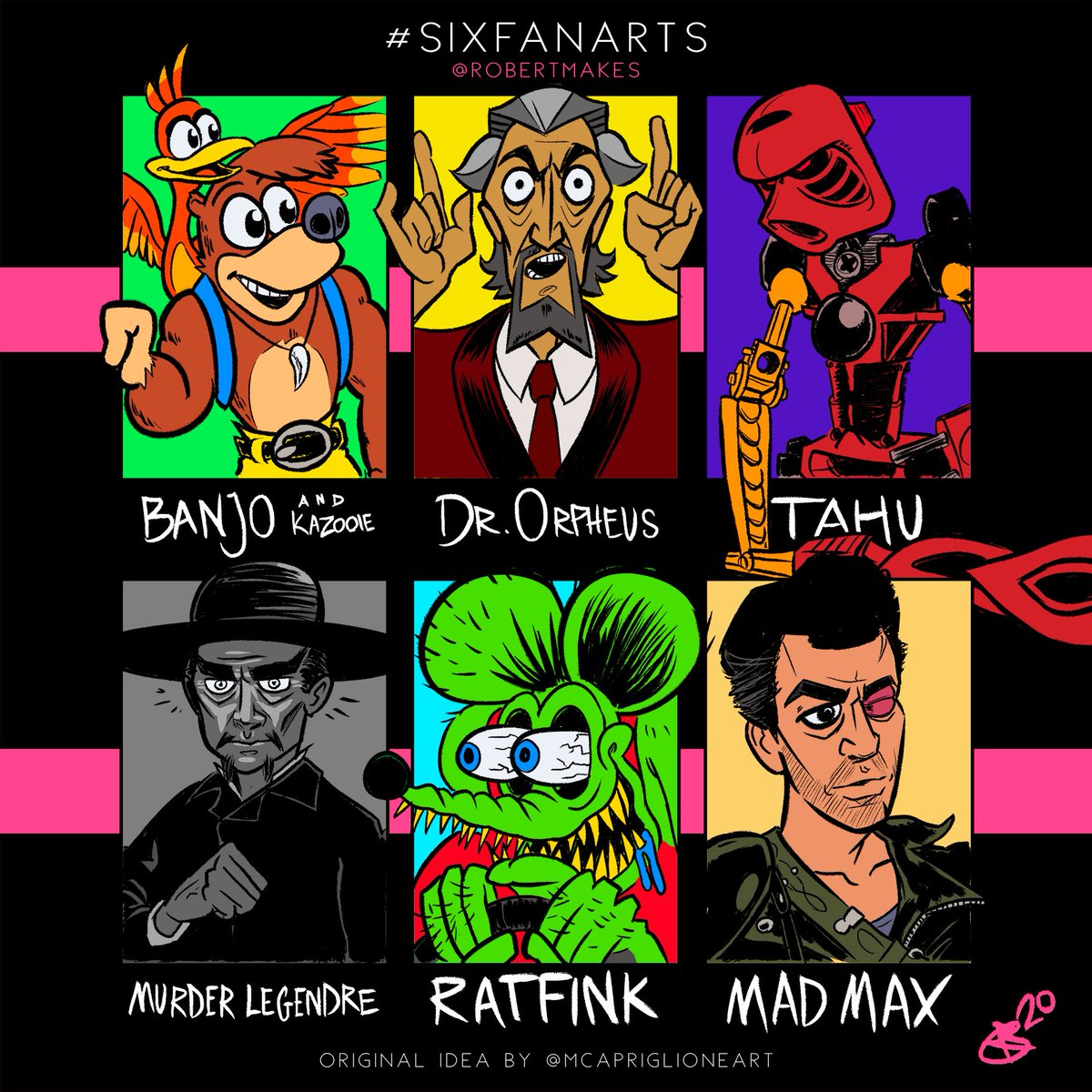 I got a lot of character suggestions between Facebook, Twitter, and Instagram. I picked the most diverse bunch of favorites that I've never drawn before. #SixFanarts #banjokazooie #drorpheus #venturebros #tahu #bionicle #murderlegendre #whitezombie #ratfink #madmax #fanart