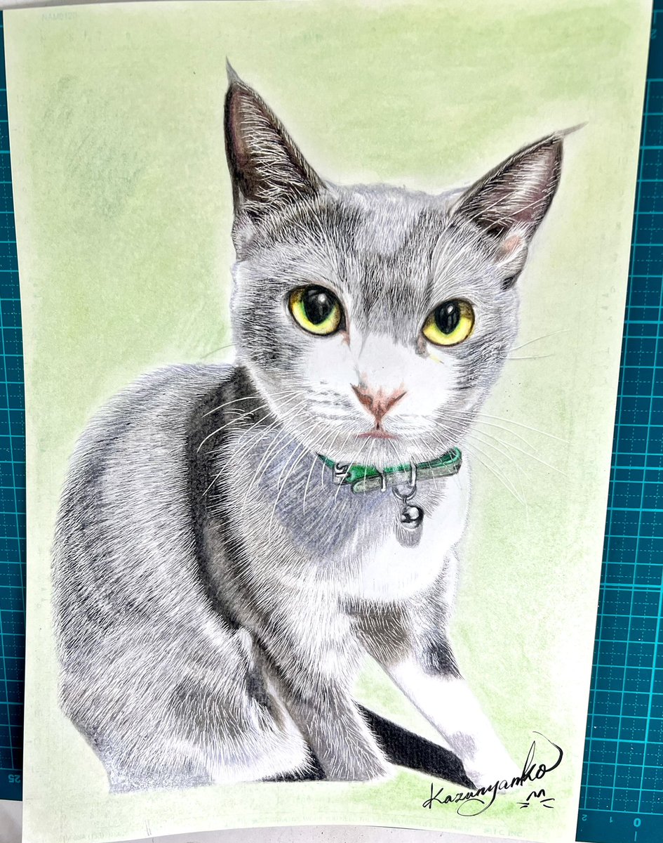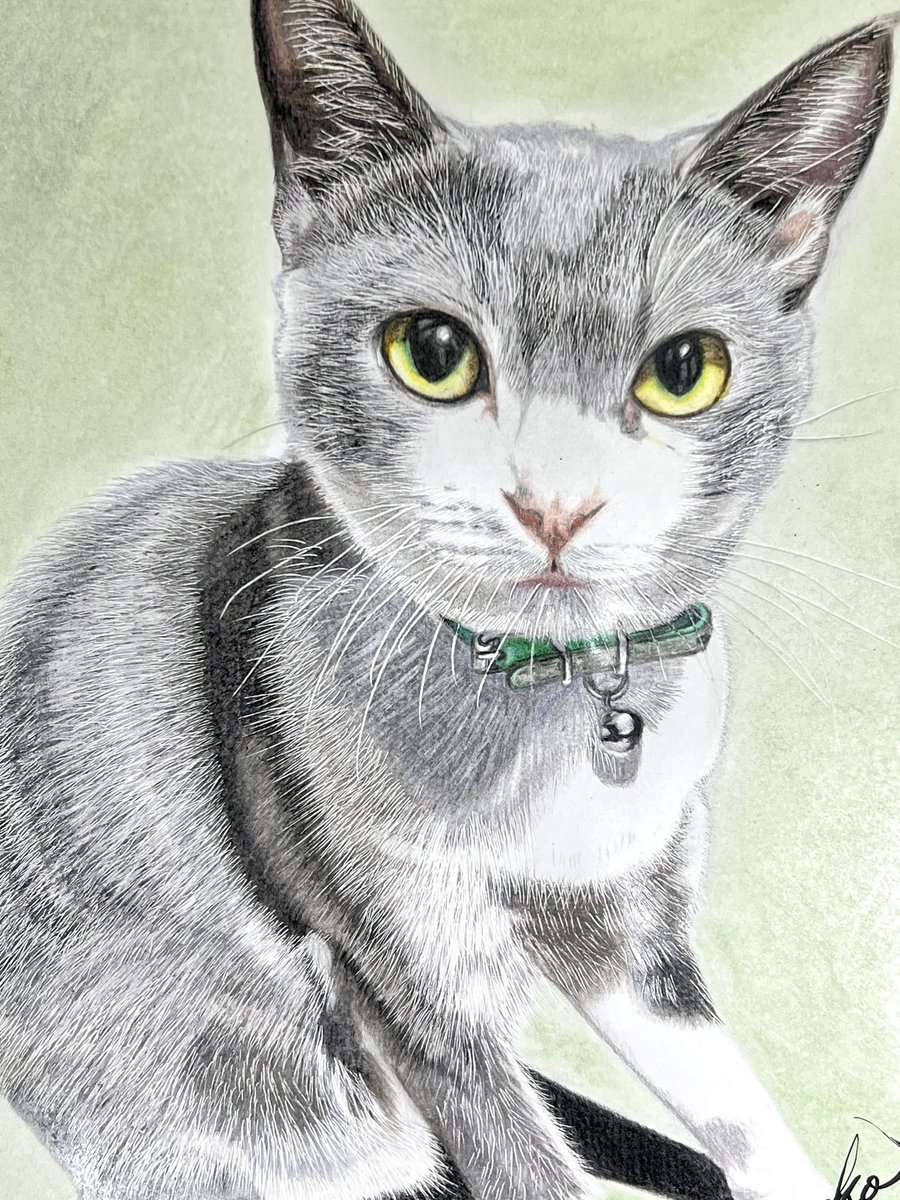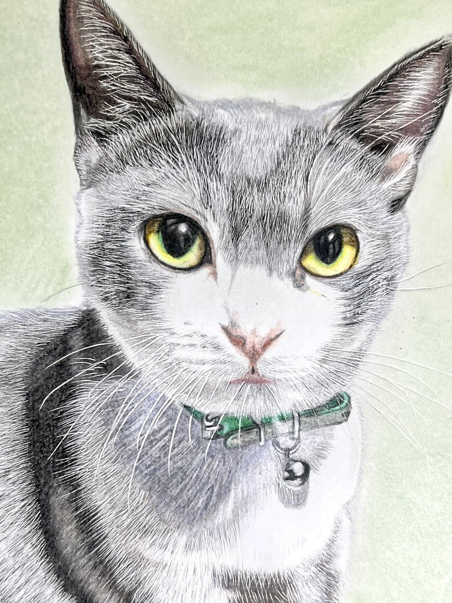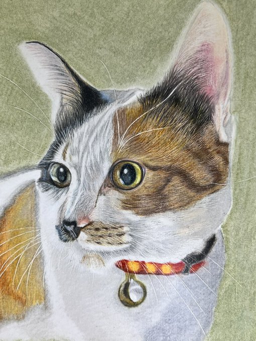 @TMzMjqAHPGcd9Y4 ぷりもチャンの絵が出来上がりました👍🏻 (*ฅ́˘ฅ̀*)♡可愛い感じで出来たので送りますね📮 光の加減で薄く見えますが思いっきりグリグリ塗ってます😄モデルありがとうございました🙇♀️✍🏻 #猫がいる暮らし #色鉛筆画 #cat #catlovers #CatsOfTwitter