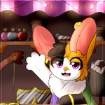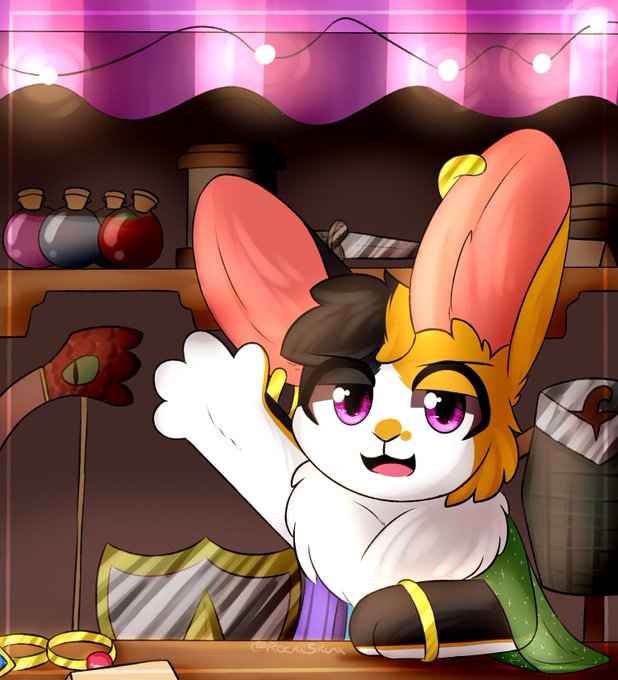 a extravagant cart filled with all kinds of magical items and trinkets rolls into town, with a flamboyant burst the shopfront opens on the side and greeting you is a peculiarly coloured rabbit~ a travelling merchant oc of mine who frequently appears in my DnD games, Zapp~
