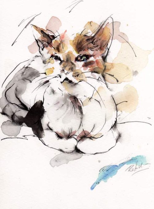 アメブロを投稿しました。 『水彩+墨汁/チャー』 ameblo.jp/tombi89/entry-… 2023年6月8日(木)〜6月13日(火)国立市ギャラリー悠にて開催する個展にも展示します。 #水彩画 #猫