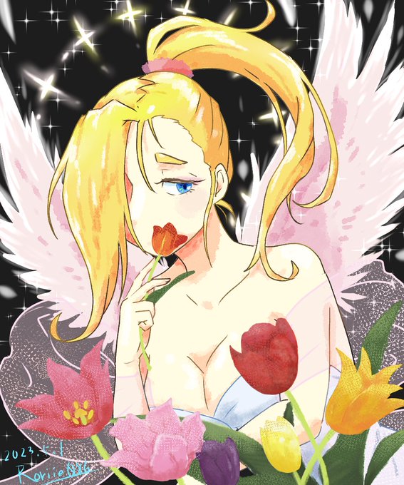 OC 巨乳無表情天使リシェ 天使だけど露出度高め。大体ポニーテール。口調は「~なのです。」 画面がとてもキラキラゴテゴテしておりますw 時期なのでチューリップも描いてみました #GWはフォロワーさんが増えるらしい #GW創作クラスタフォロー祭 #自創作に狂っている人と繋がりたい