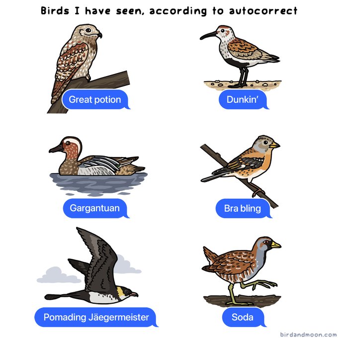 Birds I have seen, according to autocorrect. Sign up for my newsletter here: tinyletter.com/rosemarymosco