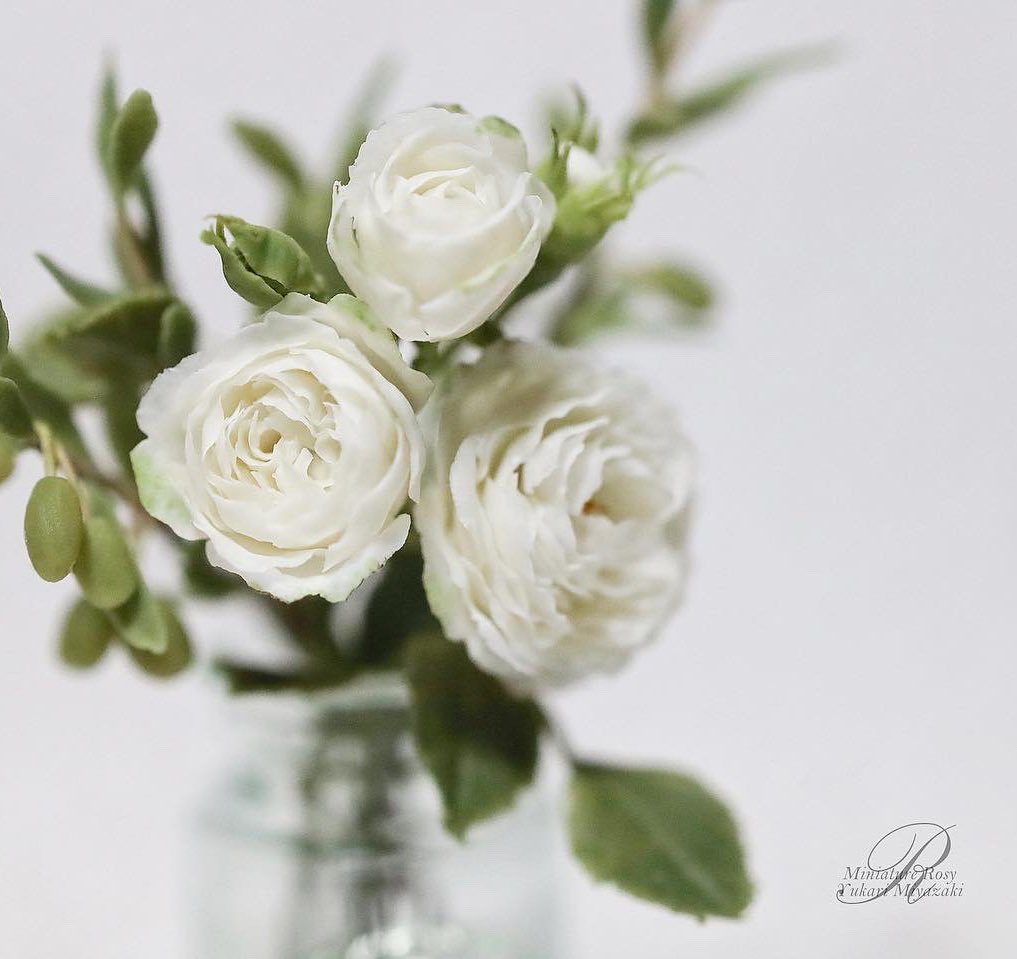 1/12サイズ クォーターロゼット咲きの白薔薇 シェドゥーブルと実付きオリーブの枝🌿🫒 アレンジメントというよりもまさに今、庭から切ってきて飾りましたというイメージで作りました #ミニチュアフラワー