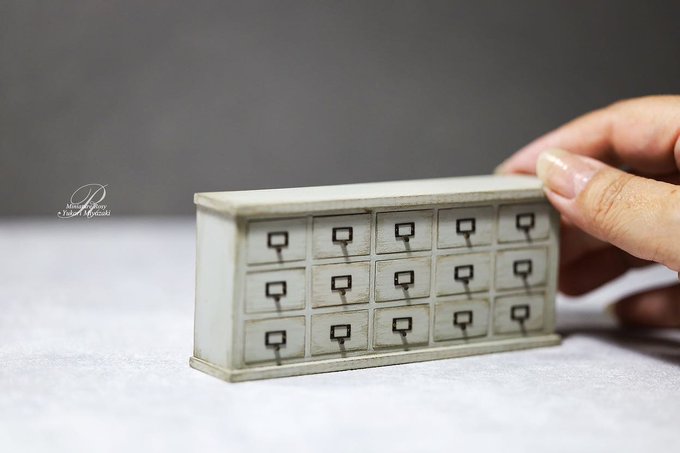 小さな引き出しがいっぱいのミニチュア家具が完成しました