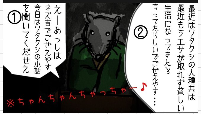 1 7 タイトル「缶詰めフルーツ詰め合わせ」 落語作りましたw ③はネズ吉の仲間が人間に追いかけられたと言う表現ですw #絵描きさんと繋がりたい #らくがき #イラスト #4コマ #4コマ漫画 #漫画が読めるハッシュタグ #漫画 #落語 #ネズミ 23/02/22 01:42