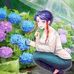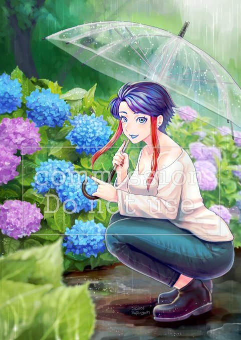 【 #Commission 】 美甘 彩様(@amami_EW )を描かせていただきました! 6月といえば梅雨、ということで紫陽花とお揃いカラーの口紅な美甘様です。雨の中でも散歩の楽しみがある季節はよいですね☔️ ありがとうございました💙 #Mikamoart