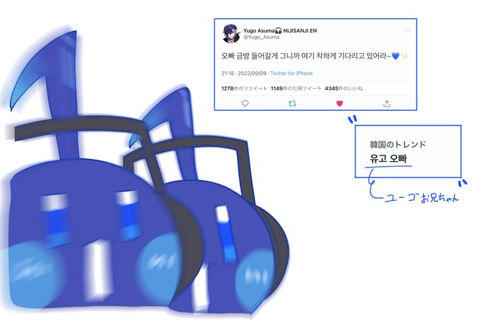 3 17 #YugoONAIR #AsumArt 今日の送信見ながら描いたrkgk 本当に楽しかったです!!400kおめでとうユーゴお兄ちゃん!!これからもずっと応援するよ💙💙✨✨ 22/10/14 23:37
