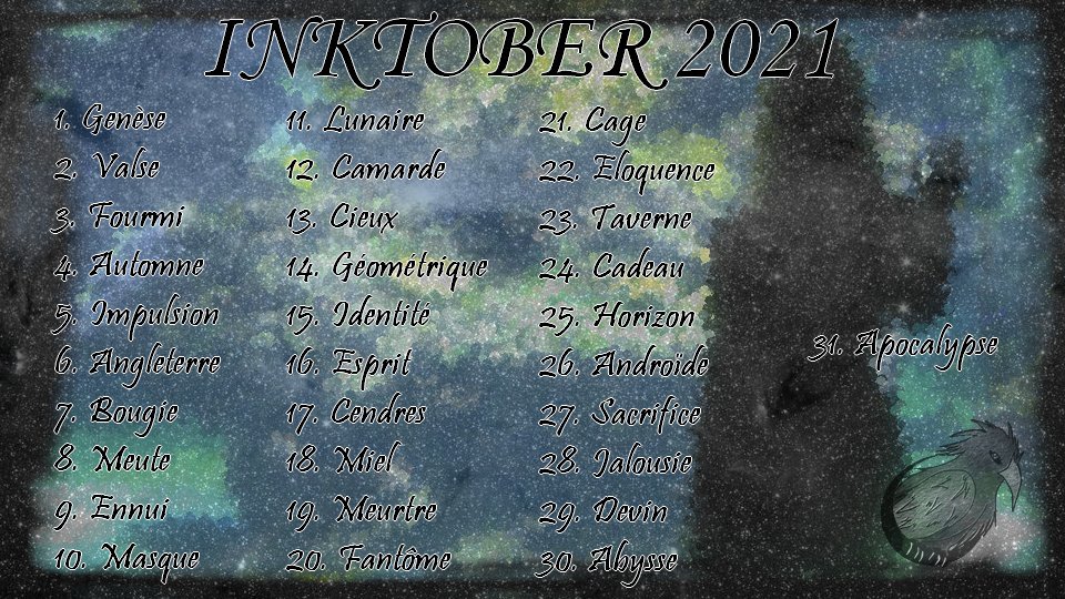 Cette année, je participe pour la première fois au #Inktober avec la liste créée par mon cher et tendre @MaestroCrow ! Ce ne sera pas forcément poussé ou très élaboré, mais le but est surtout de m'obliger à m'exercer ! J'espère y arriver ! #inktober2021