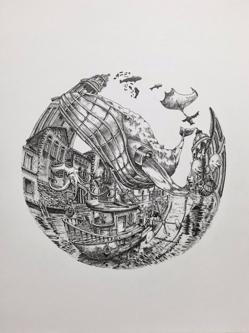 【細密画/ペン画】 ー 天球 ー #ZEROTEN2022 天球: 地球を中心として取り巻く仮想的な球体。 部屋自体が球面上に張り付く魚眼の構図。 天体の探求。 《Size》 F0 (180×140mm) 《画材》 ペン 水彩紙 #ペン画 #細密画 #魚眼パース #pendrawing #Fisheye #celestialspher