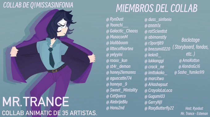 HEY HEY HEY ‼️‼️ ALERTA DE COLLAB ANIMADO DE Q!MISSASINFONIA. Después de hablarlo entre todos los artistas, ¡Animaremos Mr. Trance de Esteman! En la foto pueden ver todos los artistas maravillosos que colaborarán, manteneos atentos! 🤍 @‘s en el hilo. #MISSASINFONIAFANART