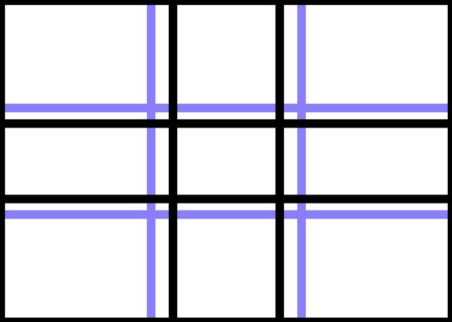 3分割(紫)もいいけど、個人的には黄金比グリッド(黒)の方がレイアウト作りやすい⭐️ キャラクター1人のショットはシングルでもバランス取りやすいし、逆に複数いる時は、3分割だとバランス取れすぎちゃってスパイダーバースとかだとちょっと好きになれなかったりする。 lifehacker.jp/article/150825…