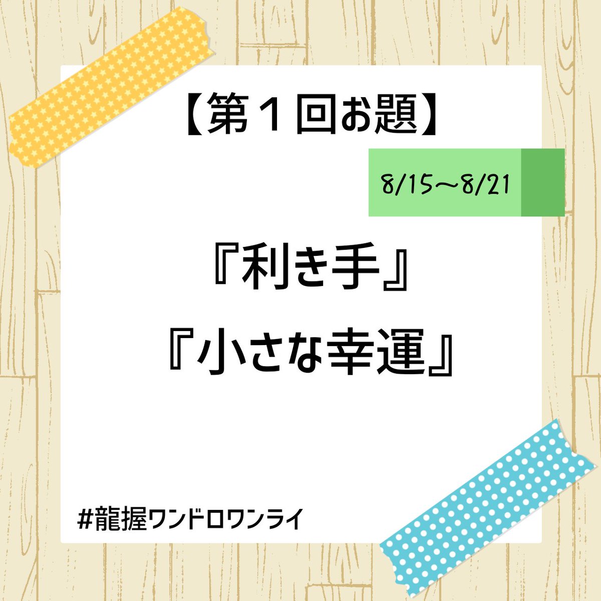 こんばんは。 ワンドロライ開催週間となりました! 8/15~8/21のお題を発表致します。 お題は『利き手』『小さな幸運』です。 作品には【#龍握ワンドロワンライ】のタグ付けをお願い致します。 ご参加お待ちしております🚒🚓🍀