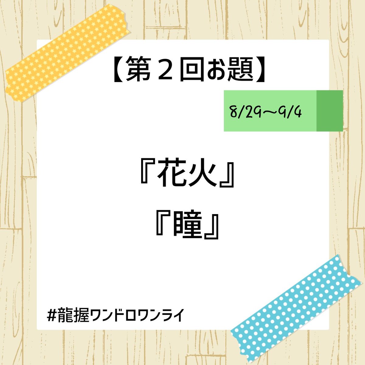 こんばんは。 ワンドロライ開催週間となりました! 8/29~9/4のお題を発表致します。 お題は『花火』『瞳』です。 作品には【#龍握ワンドロワンライ】のタグ付けをお願い致します。 ご参加お待ちしております🚒🚓🍀