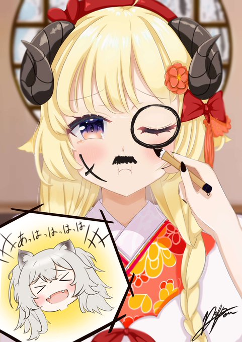 (節分は10日前……) 鬼(羊)を(腹の)内に収めんとするししろんの図 #つのまきあーと #ししらーと #わための100枚ショコラーテ