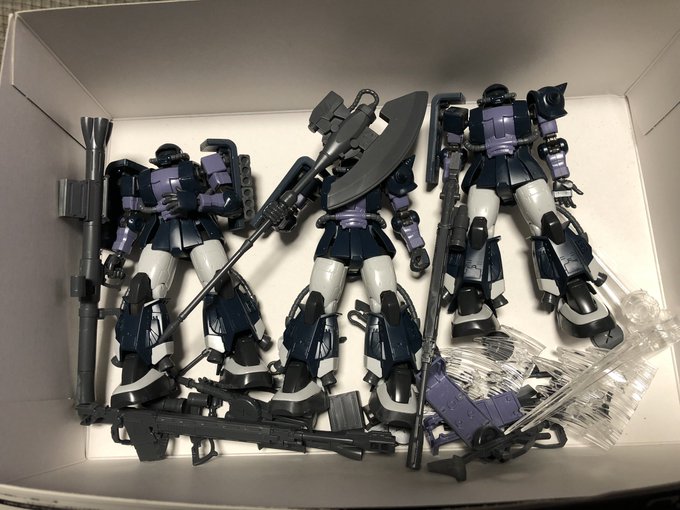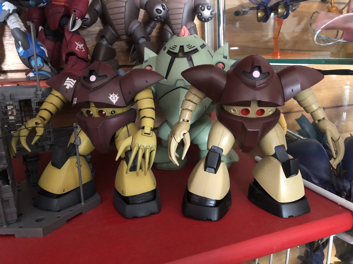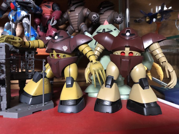 左のゴックは以前に自分が塗装したもの。右側のは今回、ヤフオクでかった素組みのゴック。そのうちバラバラにして塗装するんだ😄ゴックいいわ。 #ガンプラ好きと繋がりたい #ガンプラの画像を貼るとRTされると聞いて