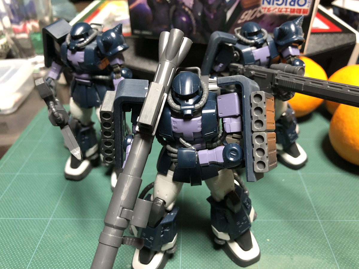 雑だけど塗り分けと隙間埋め終わりにする。 雰囲気にが出ていればいいかなってぐらい。脛が単色だとさびしかったしね。 #ガンプラ好きと繋がりたい #ガンプラの画像貼るとRTされると聞いて #ナイスザク