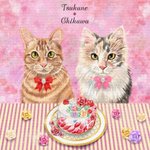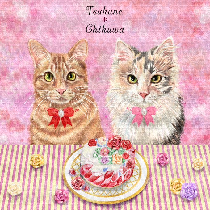 ココナラご依頼絵、つくね・ちくわちゃんです。デコレーションケーキを描いて可愛くしました🎂♪#油彩風 #動物 #ペット #似顔絵 #ココナラ #絵描きさんと繫がりたい #猫好きさんと繋がりたい