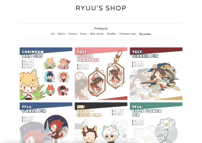 🌸🌸Ryuu's Shop Updates🌸🌸 Pre-orders for my enamel pins and other goodies will go live on April 7th at 10PM EST! #chainsawman #csm #TGCF #FF14 #FFXIV #JJK #JujutsuKaisen