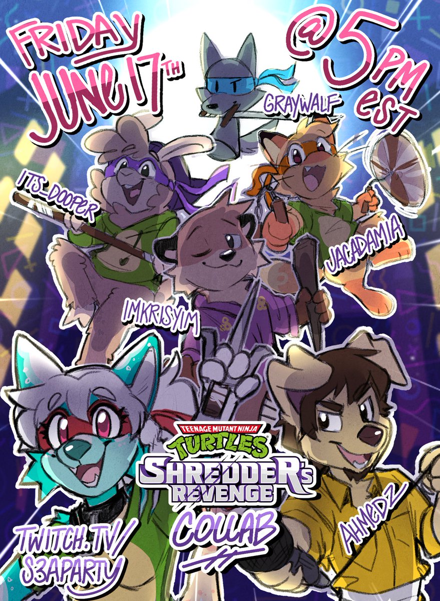⭐️🎉FRIDAY JUNE 17th @ 5PM EST🎉⭐️ Join myself, @TheBigBoofer, @imkrisyim, @jacadamiajack, @Its_Dooper, & @gray_walf as we party TMNT style for my BIRTHDAY!! 🎂 Even though the game comes out on my actual bday (the 16th), I figured we'd start off the weekend in style instead!!