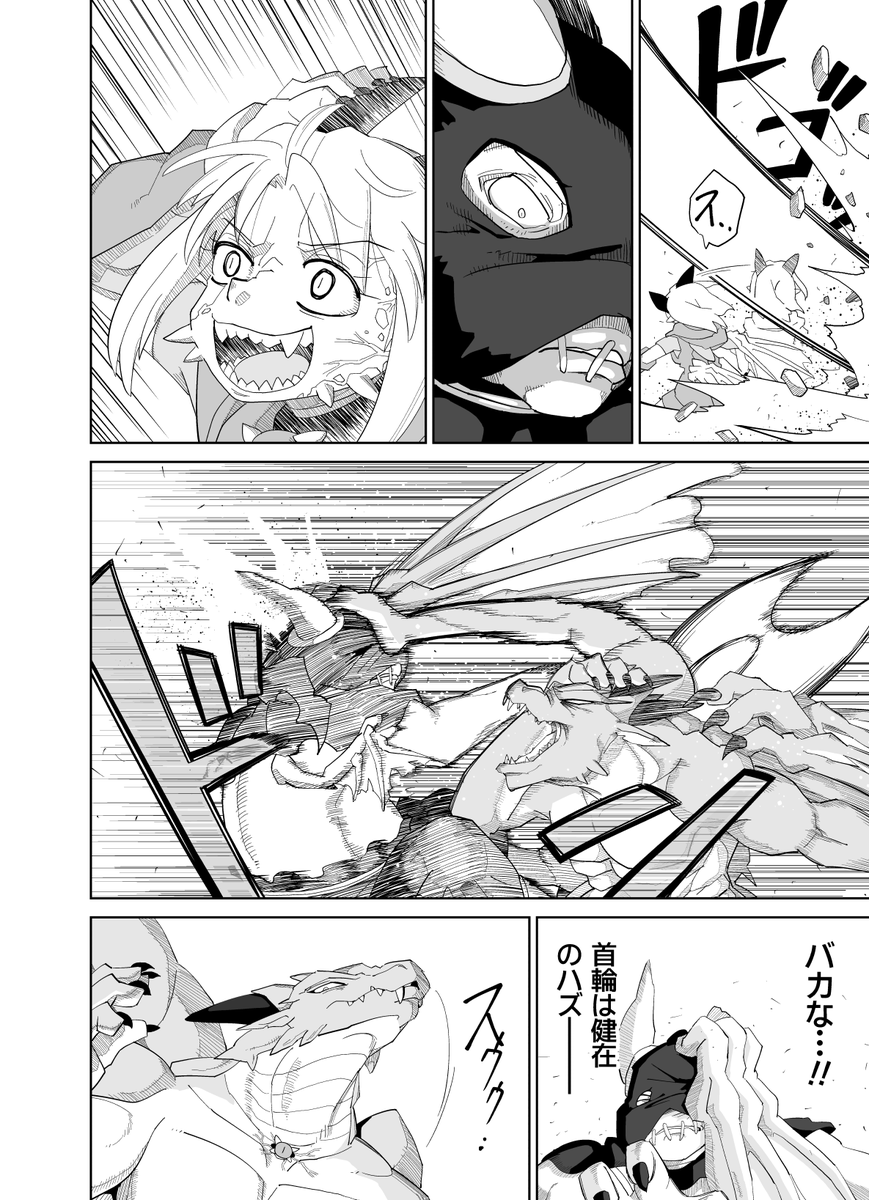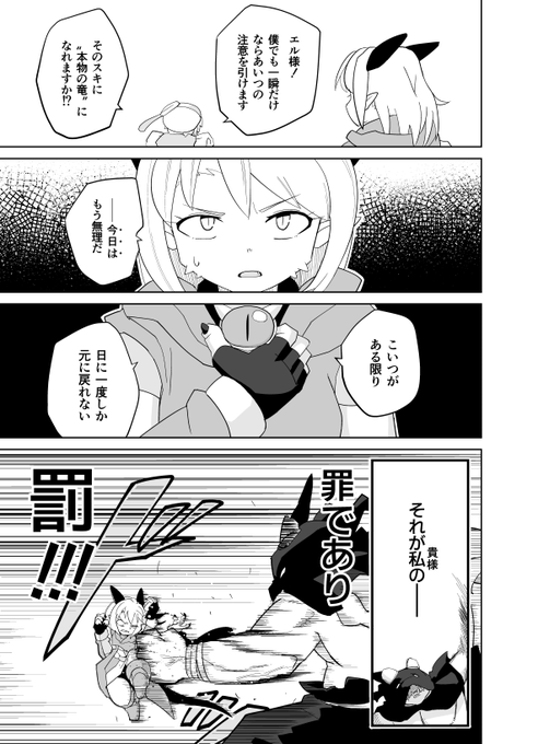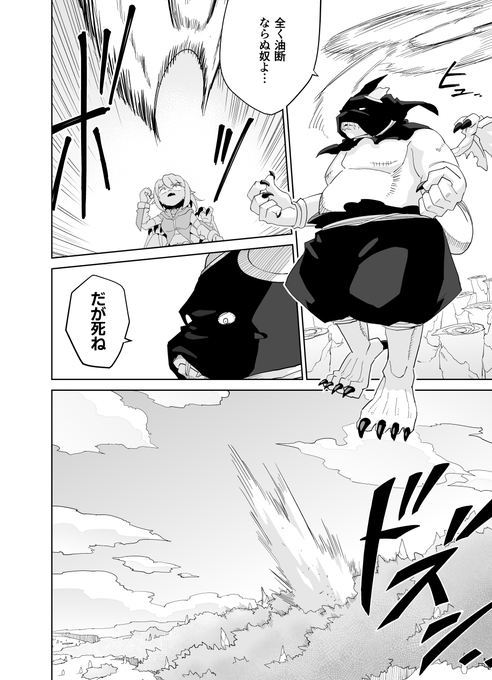 今日の竜娘漫画:18/32p プロットの時点ではこの「敵」をもっとド畜生に描く予定だったのですが、これも32pに収めるのにキャットです。 仕方ないので〇ね〇ね言わせる事で敵らしさを1.025倍くらいUPさせました。 1ページ目から読む→ #ドラゴン・カラー #漫画が読めるハッシュタグ #漫画