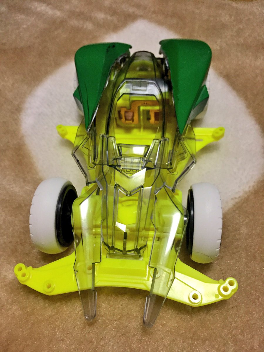 #ミテ四駆 #造形部門 マシン名 デクロスタッグビートル デクロス01とビークスパイダーゼブラのキメラマシン 羽が付いた状態では制振装置の代わりになる立体モード、全てのパーツをパージする事でバレルタイヤで走る軽量フラットモードへと切り替えできます 暗闇で光るのでナイトレースもバッチリです