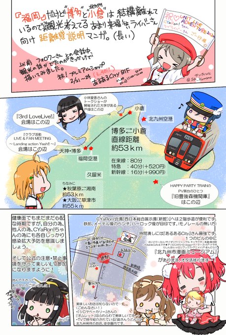 あまり福岡を知らないライバーさん向けに描きました。距離感を少しでも理解してもらえたら幸いです。 (過去LIVEとは違う地域での会場です。) 現地参加も含めて良い思い出になりますように…! #lovelive_sunshine #CYaRon! #UNITLIVEADVENTURE2020