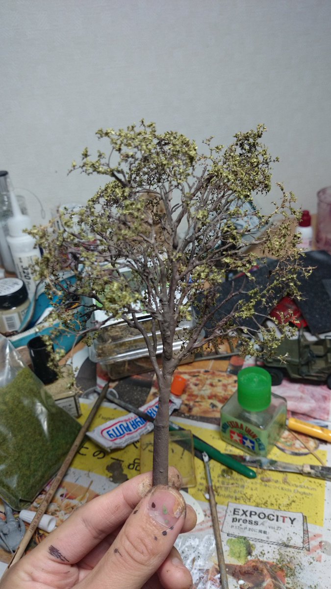#わいわいドイツ戦車プラモコンペ 先程、ミスで無言投稿したのでもう一度… 車両を置くベースの塗装と木を作っています。