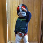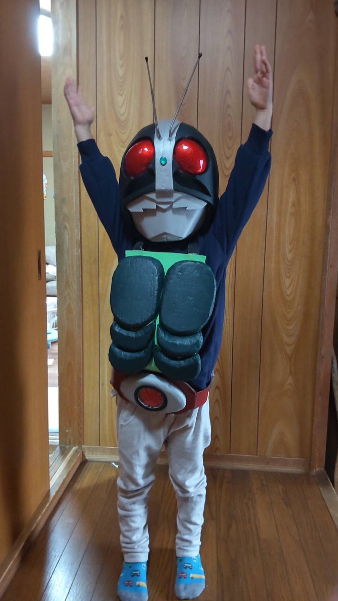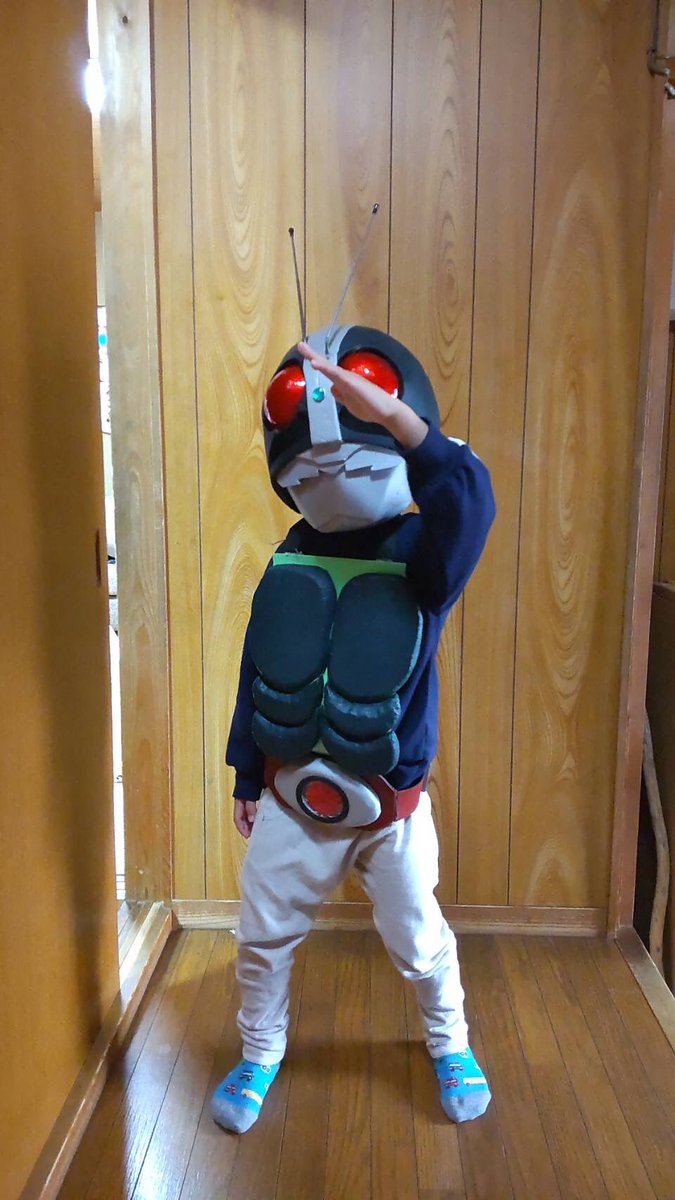 来週の村の文化祭に向けて「お子様変身セット」完成! お見せしよう!仮面ライダー!! …被写体はかなり照れてます🤣 #コスプレ #仮面ライダー #自作ガワコス