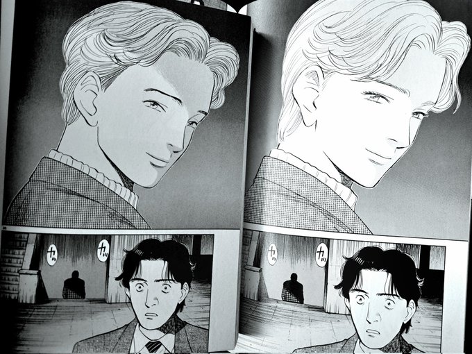 MONSTERの完全版しか持ってなかったんですが単行本を手に入れて、これ右が完全版なんですがまつ毛激盛りされててる。キャワじゃん。