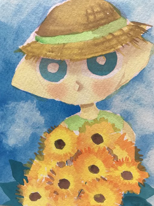 「リオンとひまわりの帽子」(葉書) #アクリル絵の具 #水彩画 #イラスト
