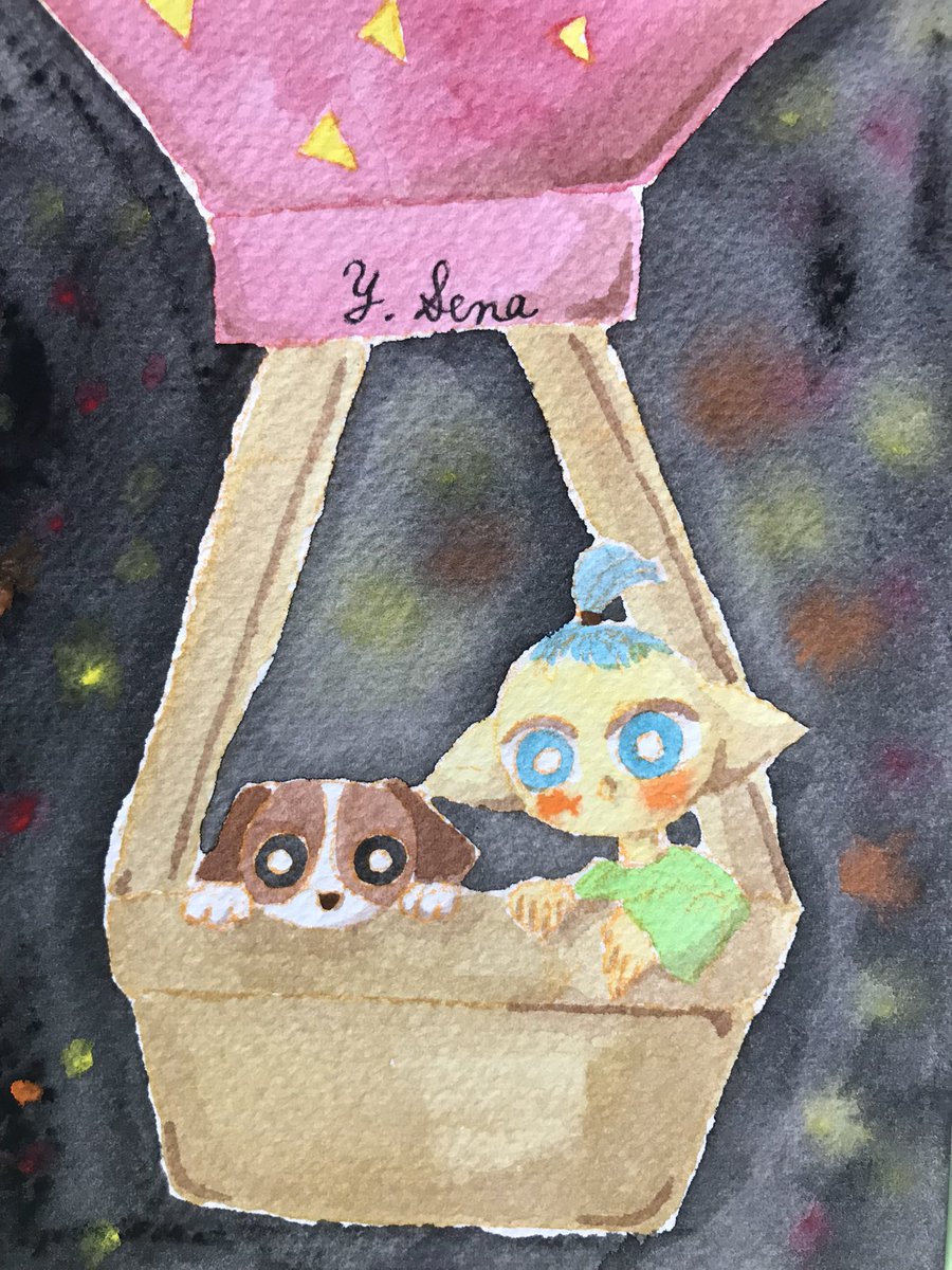 「リオンと気球に乗って」(葉書) #アクリル絵の具 #水彩画 #水彩画イラスト #art