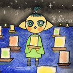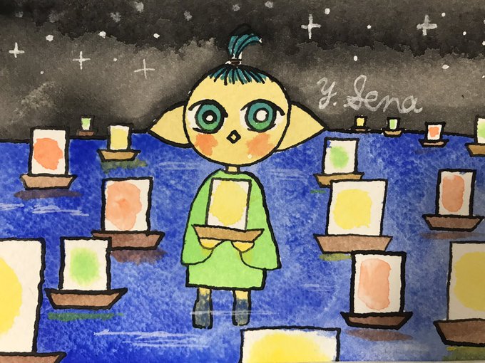 1 8 「リオンと灯籠流し」(葉書) #アクリル絵の具 #水彩画 #イラスト 22/07/27 08:51