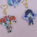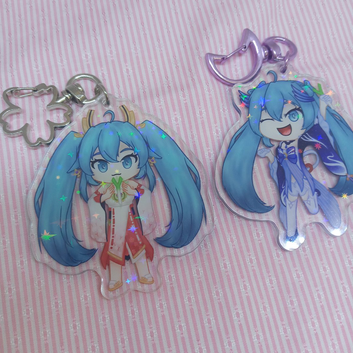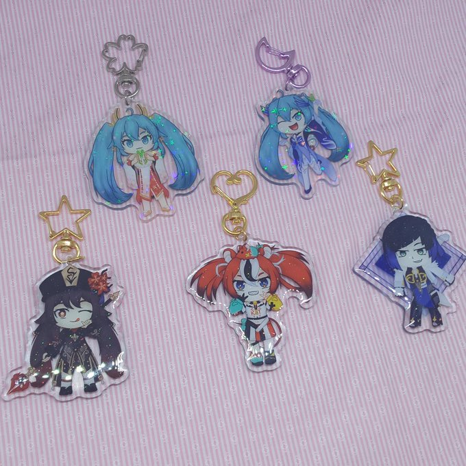 got my holocharms that i ordered from @junocharms today !! so excited to have these ready for my next booth 👁👁👁👁 #HatsuneMiku #GenshinImpact #illustrayBAE