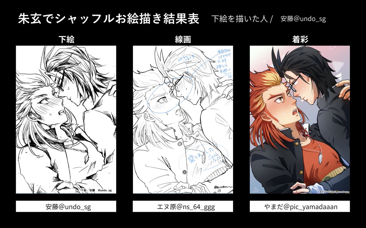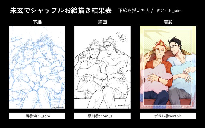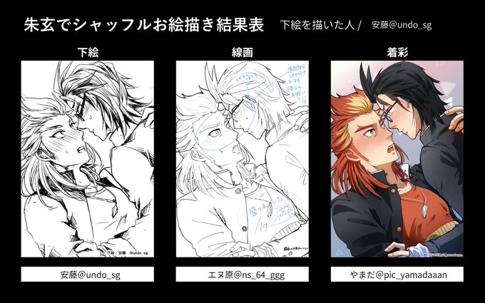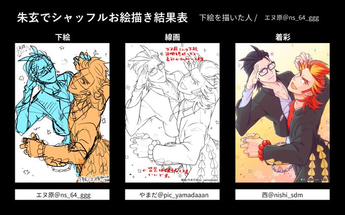 15 17 #朱玄でシャッフルお絵描き大会 結果発表です! 01 下絵:エヌ原( @ns_64_ggg ) 線画:やまだ( @pic_yamadaaan ) 着彩:西( @nishi_sdm ) 22/05/08 18:00