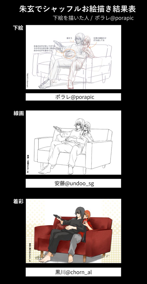 12 18 #朱玄でシャッフルお絵描き大会 結果発表です! 04 下絵:西( @nishi_sdm ) 線画:黒川( @chorn_al ) 着彩:ポラレ( @porapic ) 22/05/08 18:03