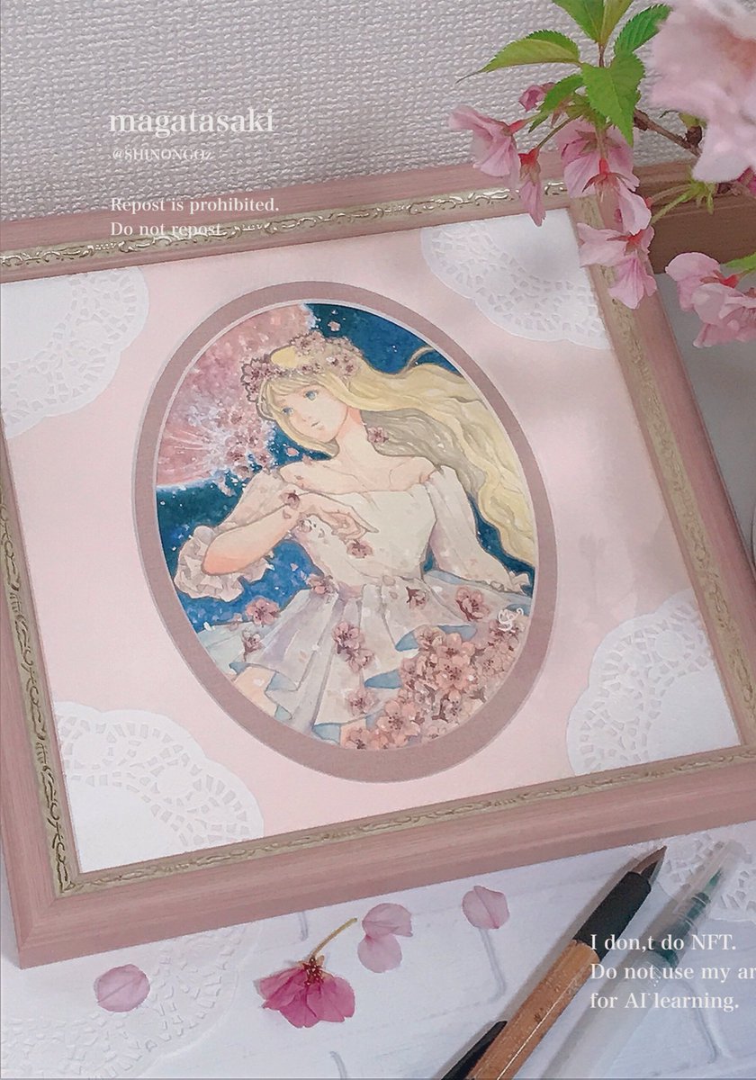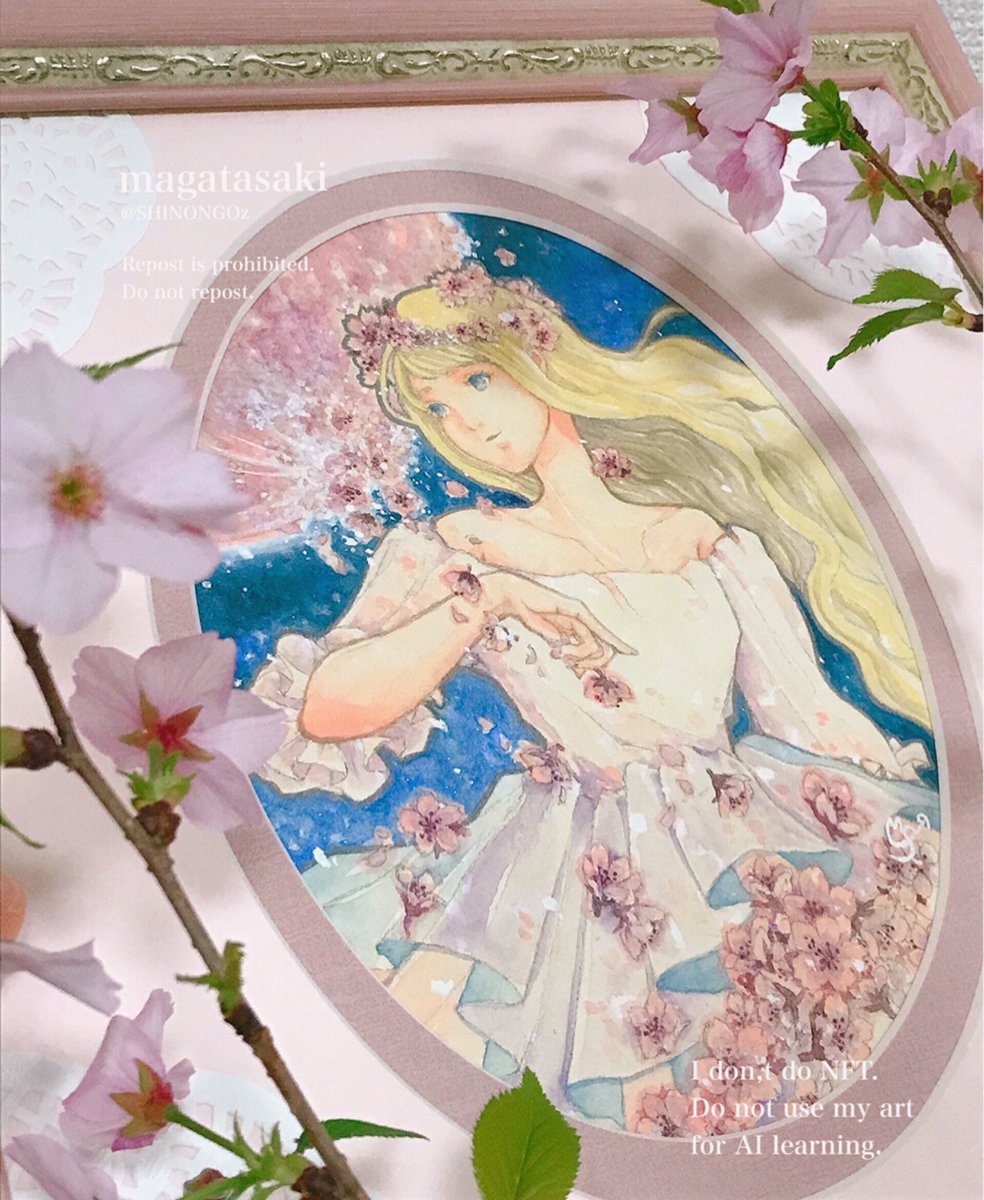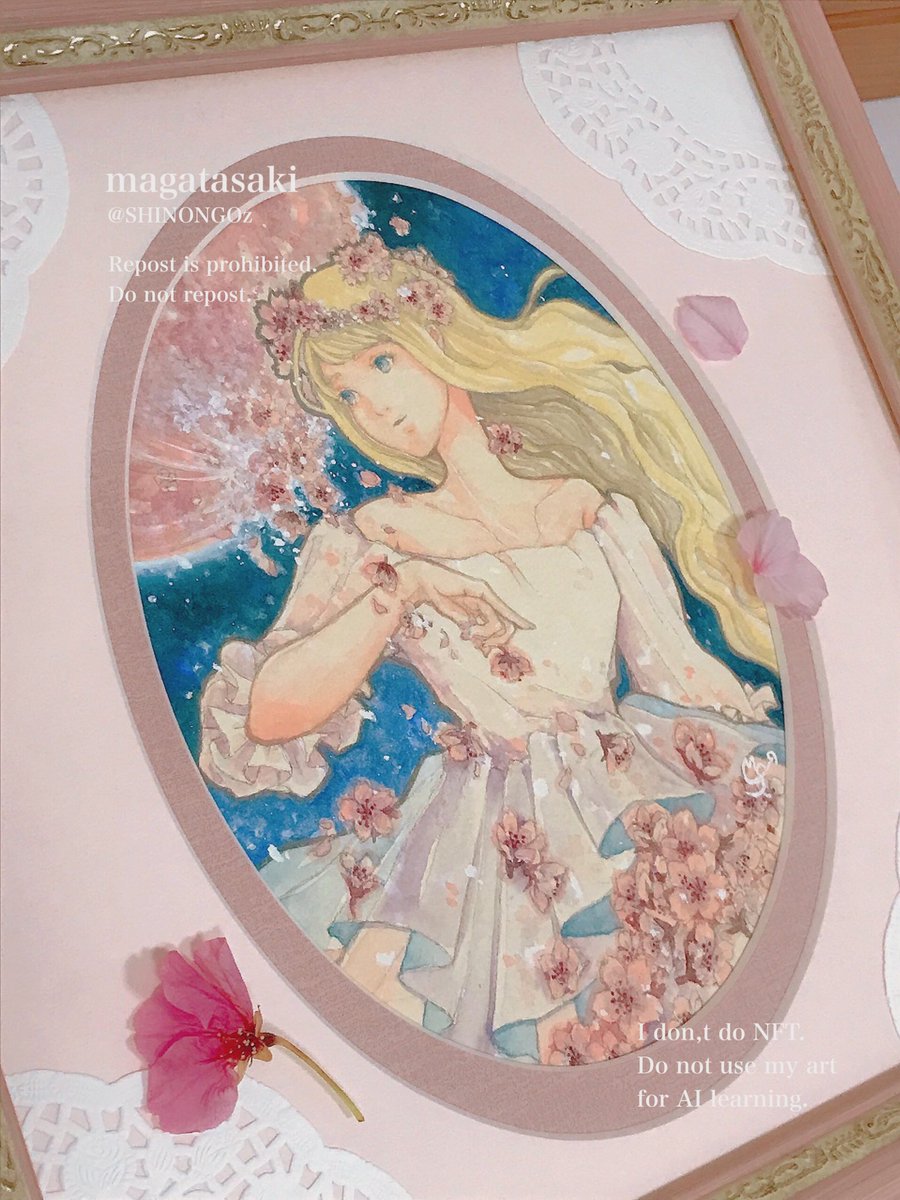 淡き月の終わりは溶けて零れる雪花。 春の女神エオストレが受け止め、一体に成りゆく作品です。 儚さと、鮮やかに再生する希望の世界観をご高覧いただければ幸いです。 作風は、アンティーク調ながらも背景の星空で神秘感を。ピンクで華やかに仕上げました。 #ピンクムーンは雪花と溶ける #透明水彩