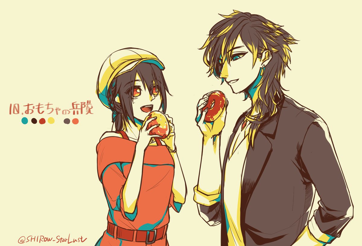 10 37 #リプをもらった番号の色を使って絵を描く のーおに様【@nouoni_】より 10.おもちゃの兵隊×ケイ早希 早希ちゃんが食べているのはオレンジドーナツ 20/05/15 20:34