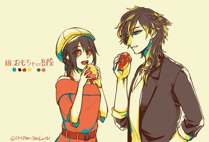 #リプをもらった番号の色を使って絵を描く のーおに様【@nouoni_】より 10.おもちゃの兵隊×ケイ早希 早希ちゃんが食べているのはオレンジドーナツ