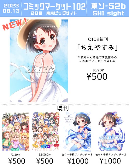 44 53 明日8/13、夏コミC102のお品書きです!新刊は千枝ちゃんのミニエピソードのイラスト本になります!ほか既刊と千枝アンソロも持って行きます。 「ソ-52b」でお待ちしております、宜しくお願いします! 23/08/12 15:00