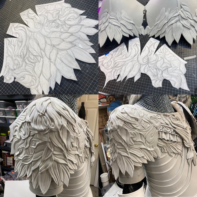 Bloody Wolf @ELDENRING armor WIP - Moving on to the shoulder pads. I hand drew each one….all 57 individual pieces per shoulder pad to match the game. Each HD-Foam piece was cut out and Dremeled to soften the edges and add the interior details. #ELDENRING#eldenringcosplay