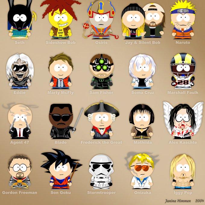 More of my drawings in SP style, based on Seth, Simpsons, Osiris, Jay & Silent Bob, Naruto, Iron Maiden, BTTF, Splinter Cell, Castlevania, NFL, Hitman, Blade, Frederick the Great, Léon: The Professional, Samsas Traum, Half-Life, DBZ, Star Wars, GTO, Iggy Pop. #southpark#fanart