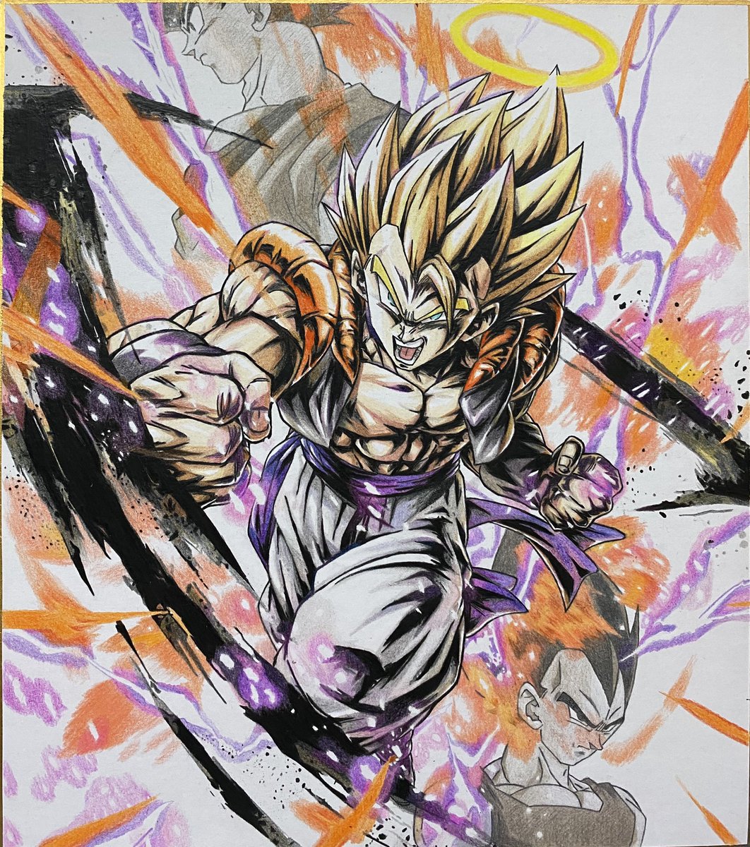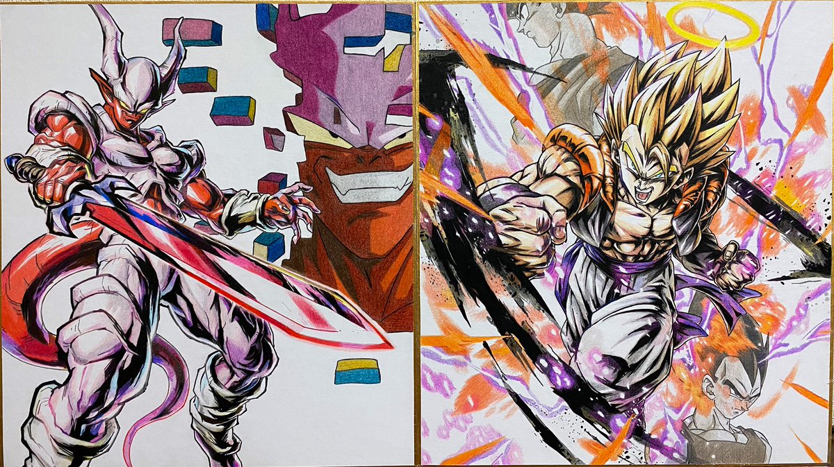 82 410 レジェンズより超ゴジータ描きました! 前に描いたジャネンバと並べたらなかなかいい感じ! #ドラゴンボール #ドラゴンボールレジェンズ #ゴジータ #色鉛筆 #模写 20/08/01 11:52