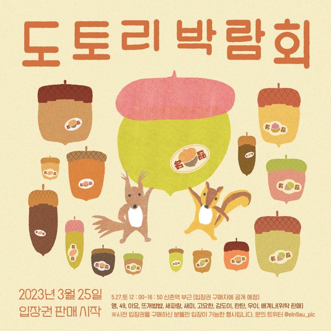 🌰도토리박람회🌰- 5월 27일 토요일 열립니다! 2차 입장권 판매폼이 이번주 토요일 8시에 오픈해요. 🍡행사 안내 노션에서 보기: young-lantern-b7c.notion.site/2495bfb2c03542… 🍡2차 입장권 판매 윗치폼 링크: witchform.com/formViewer/sli…… 🌰포스터: 도이, 세파랑🌰