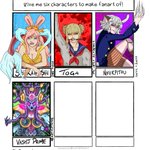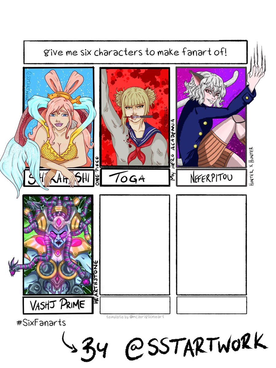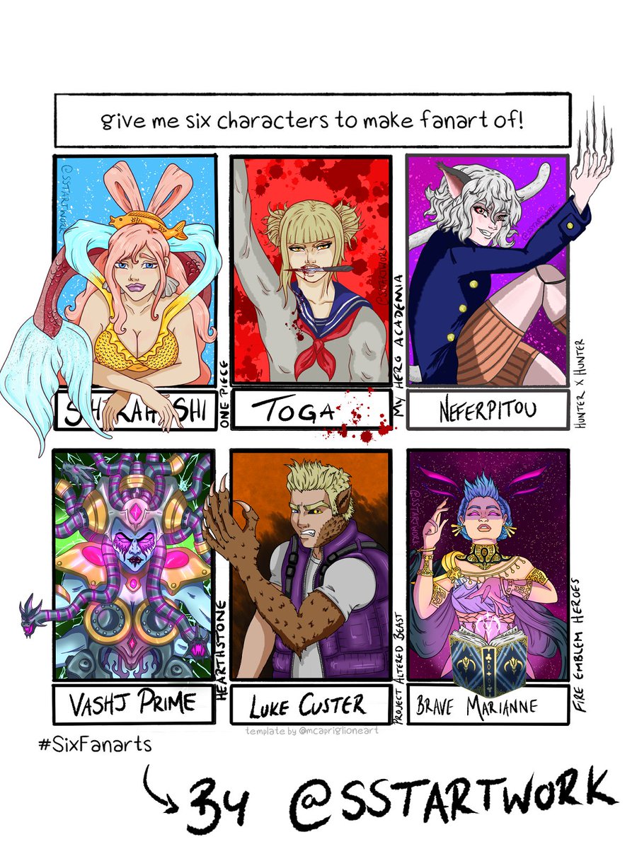 AAAAND THAT'S IT DONE! What a varied bunch! Who's your favourite? Shirahoshi from One Piece Toga from My Hero Academia Neferpitou from Hunter x Hunter Vashj Prime from Hearthstone Luke Custer from Project Altered Beast Brave Marianne from Fire Emblem Heroes #SixFanarts