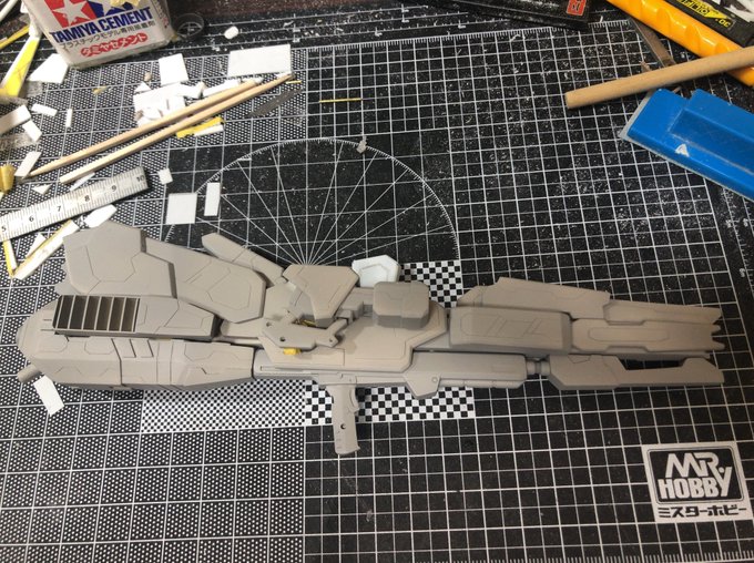 チマチマやってたFAZZ風なんちゃってメガカノンがだいたい形になったのでサフってみました。 傷直しは後にしてとりあえず背中をやっつけよう。 #リックディアス #ガンプラ