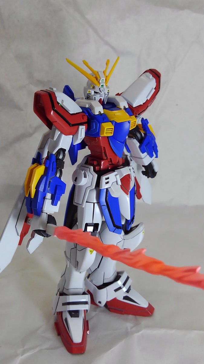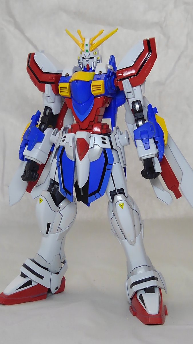 HGFCゴッドガンダムが完成しました 最近は肩アーマーが展開するらしいのでゴッドシャドー発生装置と思われるディテールを入れみました 何となくで腕を二重関節にしていますが何に使うかは不明です 作例などを参考に胴・脚部の延長、足の甲の小型化などの加工をしています #ガンプラ好きと繋がりたい