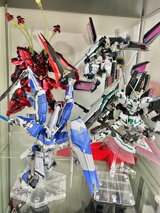 我ながら素晴らしいディスプレイな気がする。 この4体のRGとMGEXストフリを1ヶ月ちょいで作ってしまった… しばらく休憩。笑 (ガンダムベースでHGクスィー買いかけたけど堪えた。もう少し間空けて作る。笑) #ガンプラの画像を貼るとRTされると聞いて