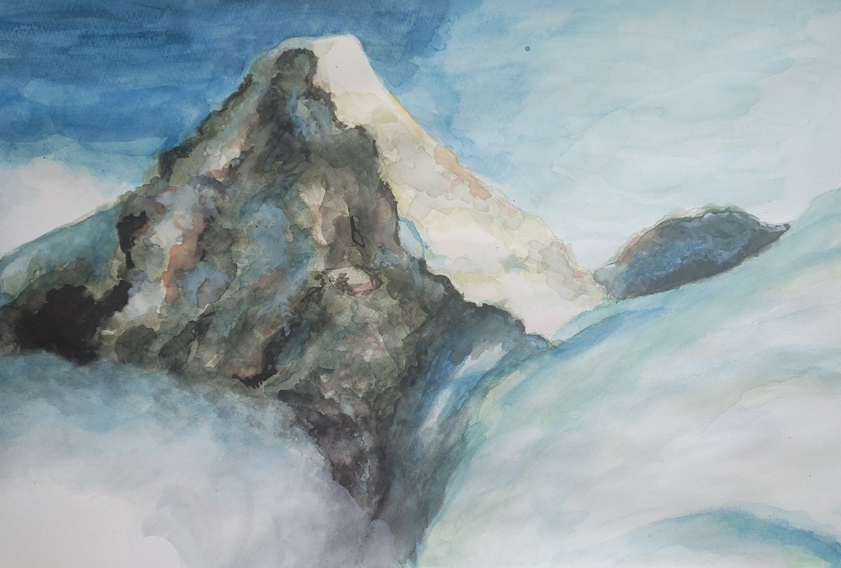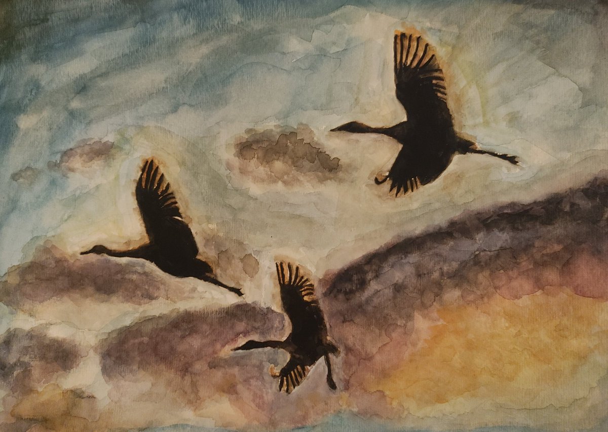 夕焼け空に舞う鶴を描きました✨ 描いてみるとシルエットでも鶴って特徴あるだな~なんて思いました。 それにしても、最初に黒塗ると後々大変だって良い勉強になったかな🐶 #水彩画 #watercolour #art #イラスト好きな人と繋がりたい #絵画 #painting